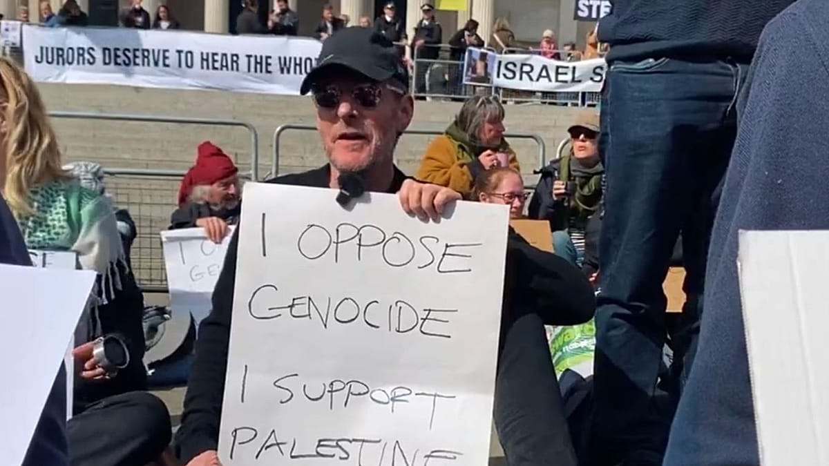 وجلس ديل نجا وسط المتظاهرين وهو يحمل لافتة كُتب عليها: “I Oppose Genocide, I Support Palestine Action”، قبل أن يقوم عناصر الشرطة بحمله بعيدا.