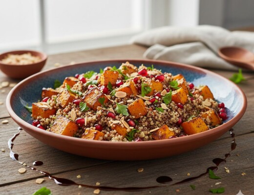 تجمع هذه السلطة الدافئة بين “السوبر فود” (الكينوا) وحلاوة القرع المشوي المكرمل، لتخلق توازناً مذهلاً بين النكهات الترابية وحموضة الرمان المنعشة. إنها ليست مجرد مقبلات، بل هي وجبة متكاملة تمنحك الطاقة والشعور بالشبع لساعات طويلة.