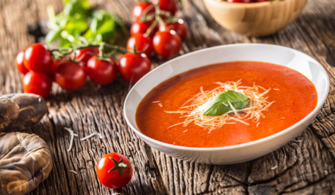 شوربة ناعمة بلون أحمر جذاب، تُحضّر من طماطم مشوية بالفرن، مع لمسة ريحان طازج وجبن كريمي يذوب على الوجه، ما يجعلها طبقًا غنيًا بصريًا وسهل التصوير.