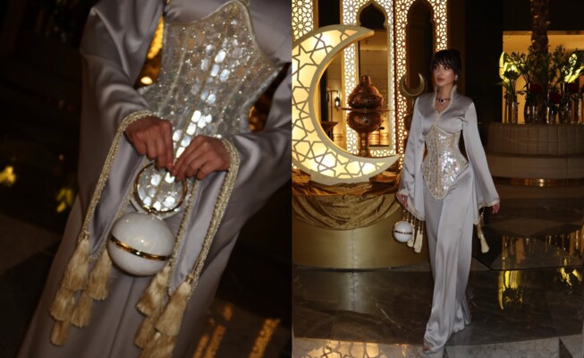 ارتدت فستاناً فضياً لامعاً من الساتان مؤلفاً من قطعتين، جمعت بين عباءة بأكمام واسعة وشراشيب راقية من الأعلى وكورسيه معدني يبرز قوامها، بينما جاء الجزء السفلي في شكل بنطال واسع مبتكر.