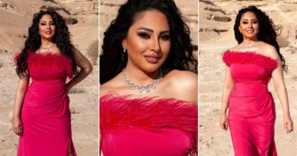 نشرت الممثلة المصرية رحاب الجمل صور من جلسة تصوير لها، ظهرت وسط الصحراء بفستان وردي طويل مزين بريش من منطقة الصدر، مكشوف الكتفين من تصميم إسلام سعد.