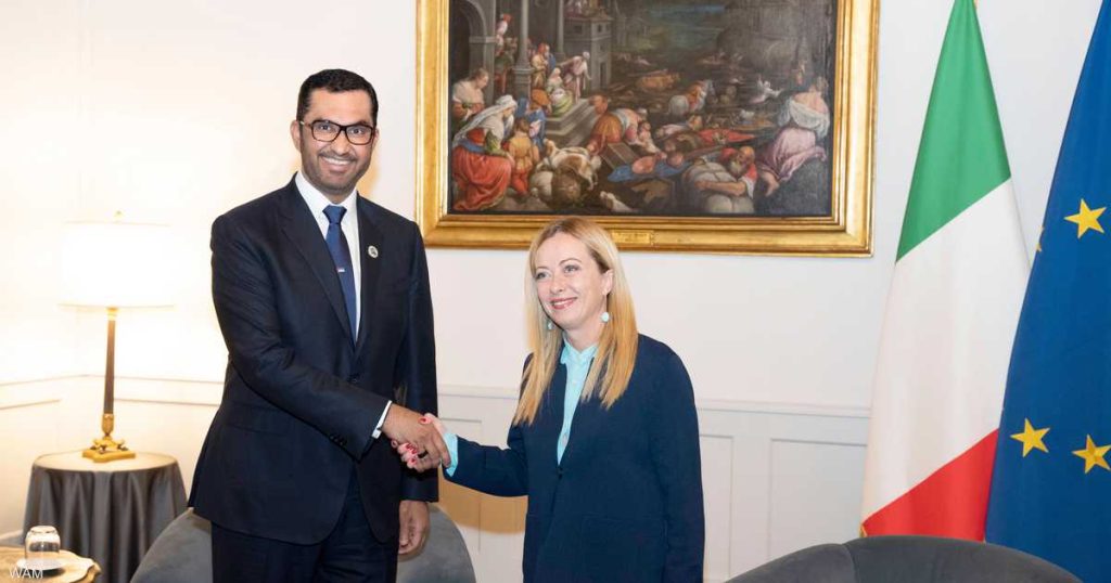 كما رحب بجهود رئيسة الوزراء الإيطالية الداعمة للعمل المناخي، خاصةً في مجال توسيع نطاق الاعتماد على مصادر الطاقة النظيفة بالتزامن مع خفض انبعاثات منظومة الطاقة الحالية، بما يتماشى مع دعوة رئاسة COP28 إلى زيادة القدرة الإنتاجية لمصادر الطاقة المتجددة عالمياً ثلاث مرات بحلول عام 2030، وإزالة انبعاثات جميع مصادر الطاقة في الوقت نفسه.
