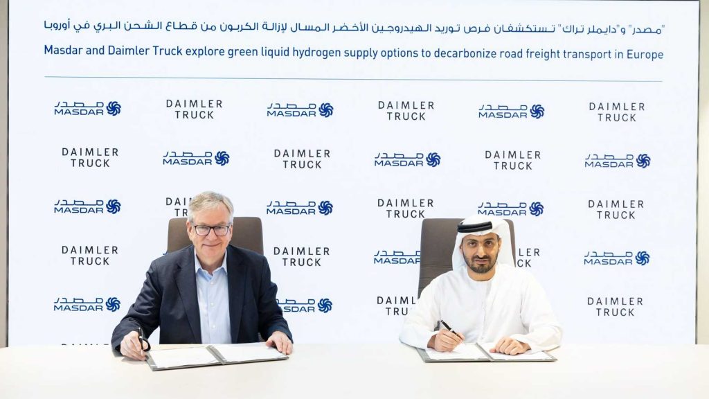 وقعت شركة أبوظبي لطاقة المستقبل “مصدر”، مذكرة تفاهم مع شركة “دايملر تراك”، المتخصصة في تصنيع المركبات التجارية، من أجل استكشاف جدوى تصدير الهيدروجين الأخضر المسال من أبوظبي إلى أوروبا بحلول عام 2030، بحسب ما نقلته وكالة الأنباء الإماراتية “وام”، الخميس.
