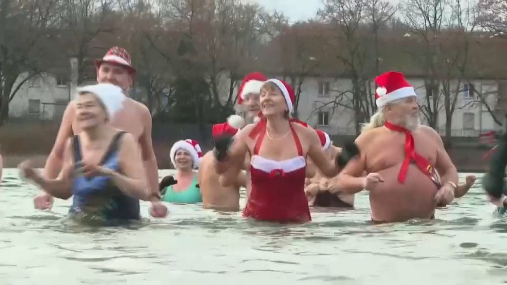 أقبل عدد من الألمان المنخرطين في ناد للسباحة في برلين على الغطس في بحيرة “أورانكي”، وهم يرتدون قبعات سانتا كلوز، وذلك في تقليد دأبوا على ممارسته في يوم الاحتفال بعيد الميلاد.