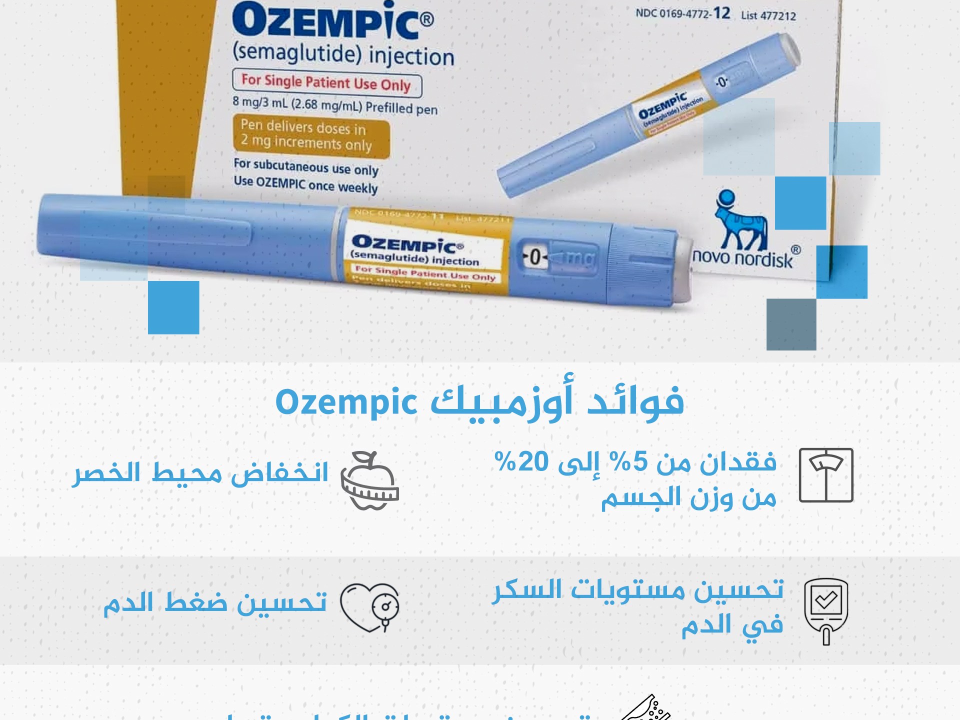 انفوغراف "أوزمبيك" (Ozempic) علاج لداء السكري من النوع الثاني "ويغوفي" (Wegovy) علاج لخفض الوزن أوزمبيك ويغوفي سيماغلوتايد (semaglutide) "أوزمبيك" (Ozempic) و"ويغوفي" (Wegovy). والمادة الفعالة في عقاري أوزمبيك وويغوفي تُسمى "سيماغلوتايد" (semaglutide).