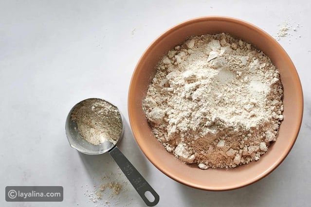 1. في وعاء، امزجي دقيق الحنطة مع الملح والسكر.