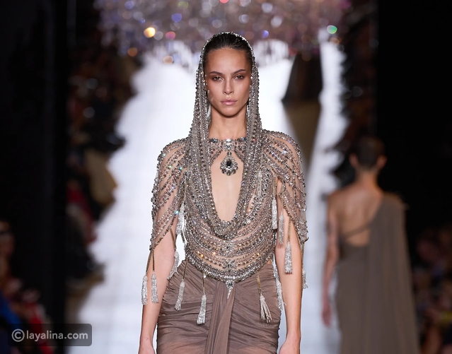 - افتتحت زهير مراد المجموعة بمجموعة رائعة من الفساتين المزينة بسلاسل فضية وذهبية مزينة بأحجار الراين.