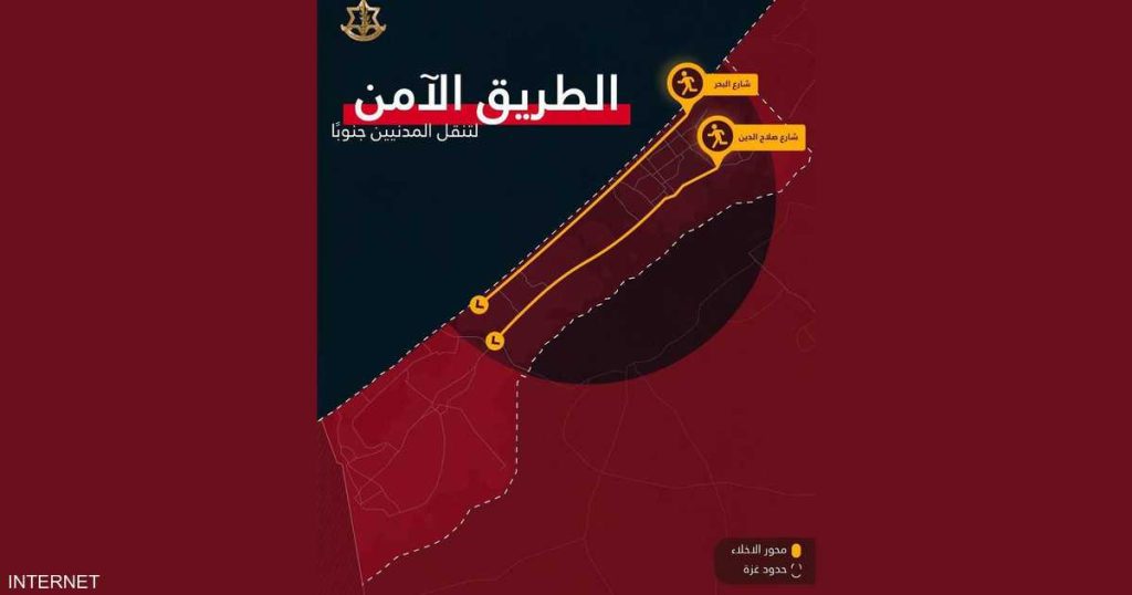 وقال الجيش الإسرائيلي في بيان إنه سيسمح لسكان مدينة غزة باتجاه منطقة وادي غزة جنوبا، عبر شارعي صلاح الدين والبحر.