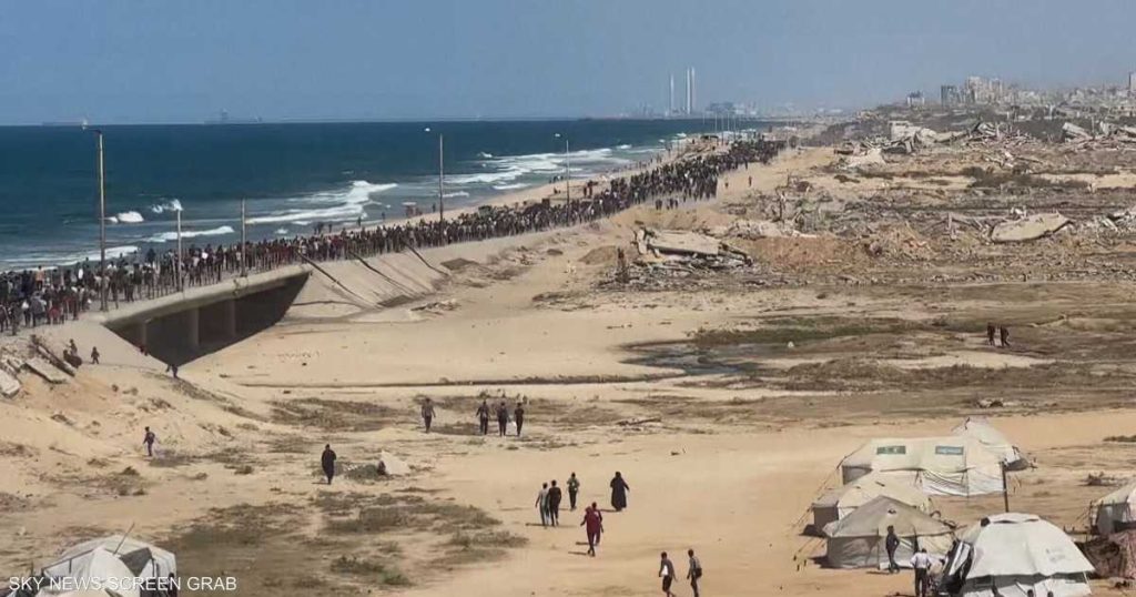 ومباشرة بعد بدء وقف إطلاق النار، أظهرت فيديوهات عودة آلاف النازحين الفلسطينيين من وسط وجنوبي قطاع غزة للشمال عبر شارع الرشيد.