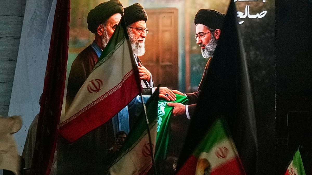 وفي طهران، عكست إحدى الجداريات البارزة في ساحة “ولي عصر” الرسالة السياسية التي تسعى السلطات لإبرازها، حيث تظهر صورة لمجتبى خامنئي وهو يتسلم العلم الإيراني من والده الراحل علي خامنئي، فيما يطل آية الله روح الله الخميني، مؤسس الجمهورية الإسلامية، في الخلفية.