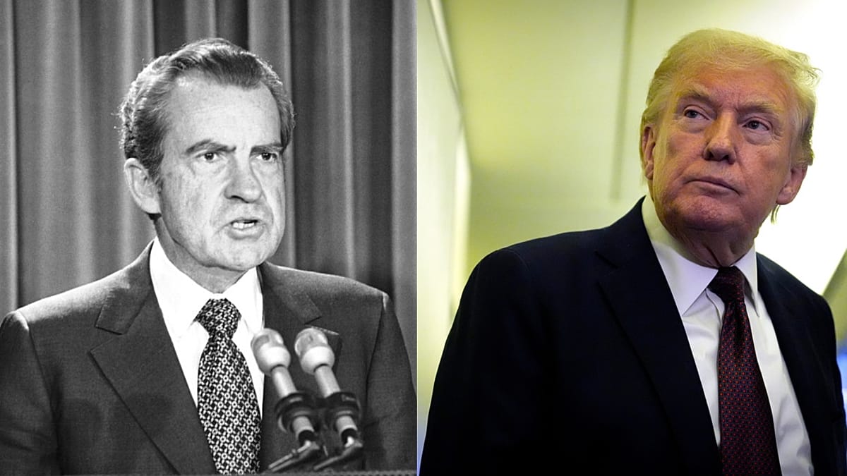 كما يسلط الضوء على العلاقة الرمزية بين ترامب ونيكسون، إذ تبادل الرجلان الرسائل في ثمانينيات القرن الماضي، وأعرب ترامب حينها عن إعجابه بالرئيس السابق، فيما كتب له نيكسون عام 1990 مؤيداً إياه في مواجهة الهجوم الإعلامي. كذلك، يرتبط أحد المقربين من ترامب، روجر ستون، بنيكسون بشكل وثيق، بعد أن عمل مساعداً له ويحمل وشماً له على ظهره.