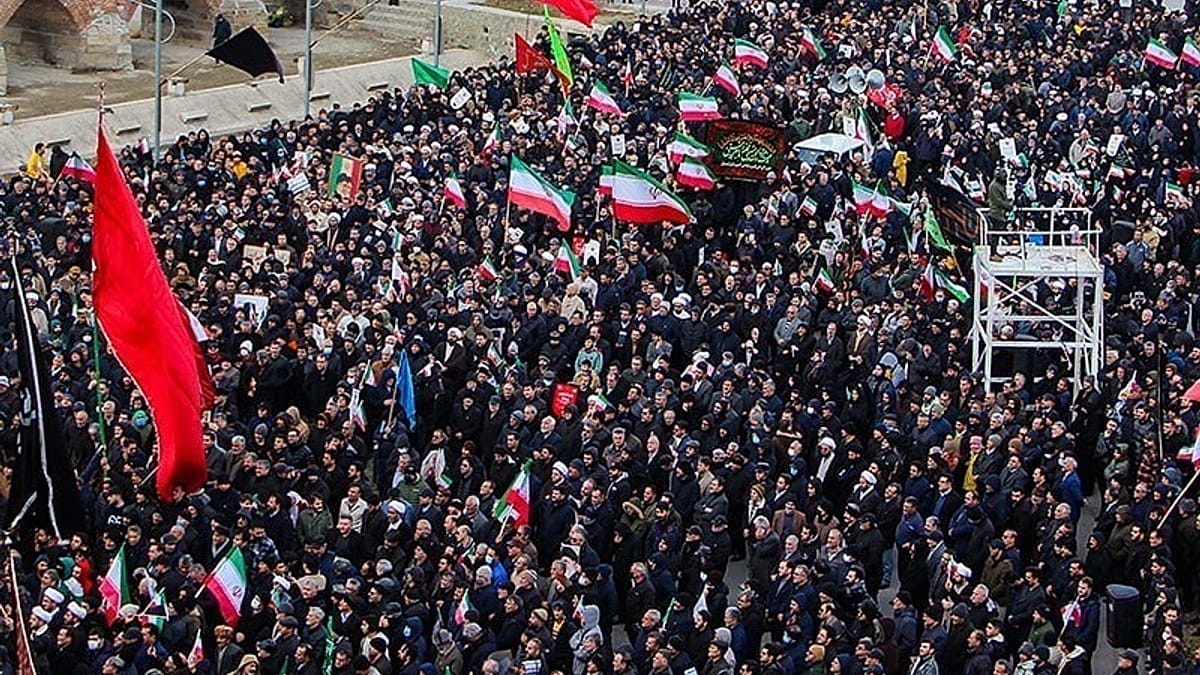 تظاهر آلاف الإيرانيين، الإثنين، في ساحة انقلاب (ساحة الثورة) وسط طهران، رافعين أعلام الجمهورية الإسلامية، تلبية لدعوة الرئيس مسعود بيزشكيان.