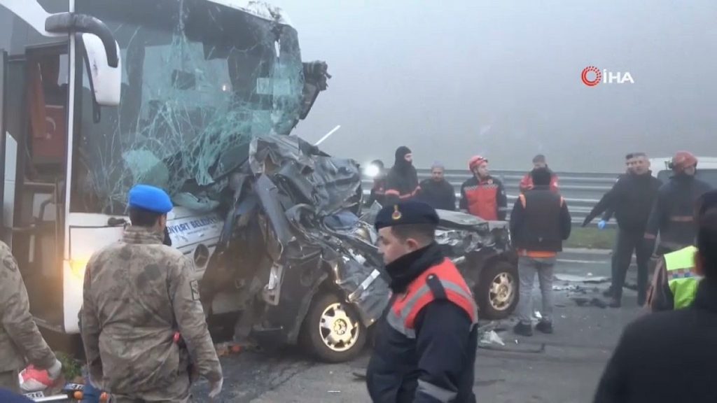ووقع الحادث وسط ضباب كثيف وانخفاض مستوى الرؤية على طريق مرمرة الشمالي السريع في محافظة سكاريا، على بعد حوالي 150 كيلومترا (93 ميلا) من إسطنبول.