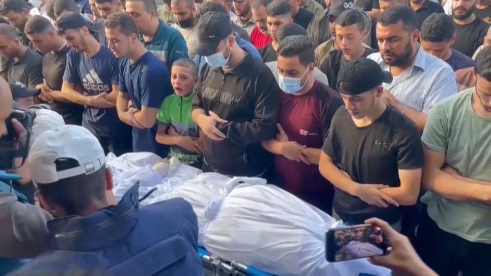 وتظهر اللقطات المصورة مجموعة من الفلسطينيين وهم يصلون على جثمان القيادي خارج مستشفى الأقصى في دير البلح.