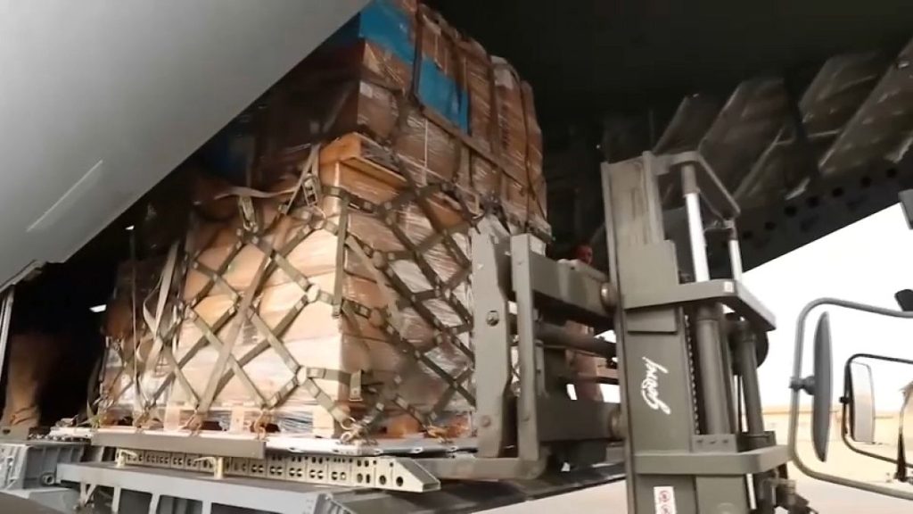 وتحمل الطائرتان 61 طناً من المساعدات بما في ذلك كميات من الأدوية من قطر وفرنسا. وقد وصلت الأدوية إلى مصر وهي في طريقها إلى القطاع عبر الحدود.