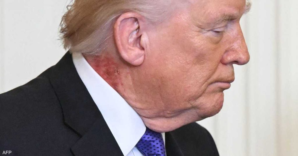 وظهر الاحمرار على الجانب الأيمن من رقبة ترامب فوق خط الياقة مباشرة في صور التقطت له خلال مشاركته في مراسم منح وسام الشرف يوم الاثنين.