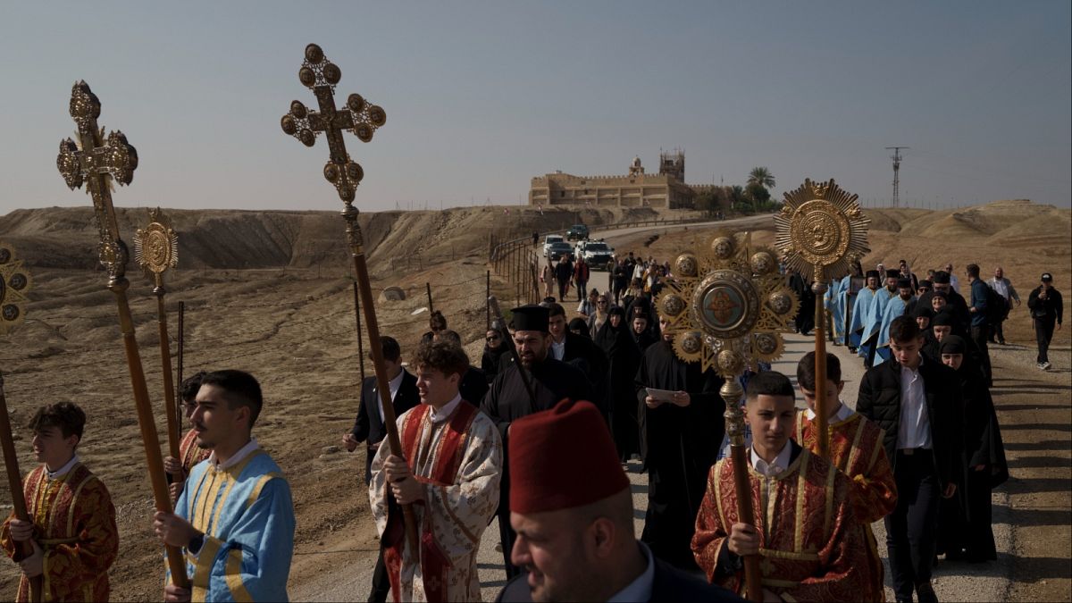 سار العشرات من المسيحيين في موكب من كنيسة قصر اليهود للروم الأرثوذكس مع بطريرك القدس اليوناني ثيوفيلوس الثالث للاحتفال بعيد الغطاس.