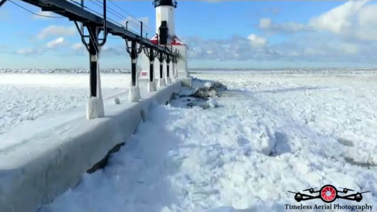 فيديو. شاهد: الثلوج تغطي بحيرة ميشيغان ومنارة المدينة بعد عاصفة ثلجية عاتية