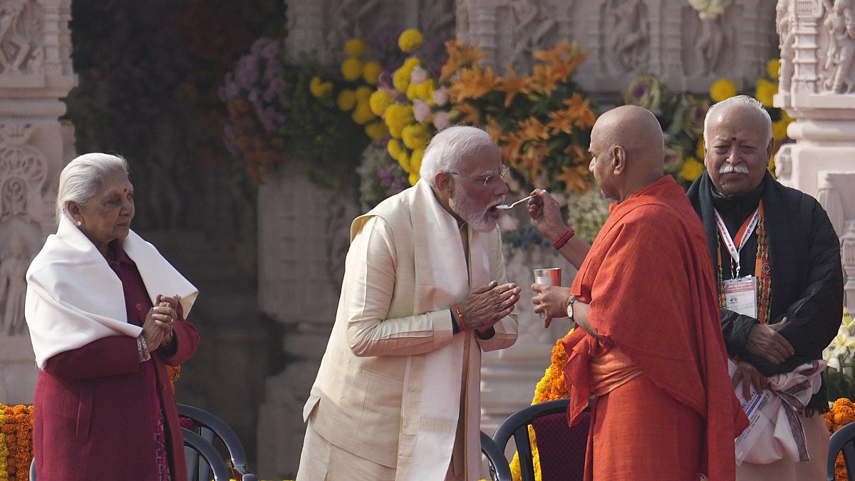 وشُيّد المعبد الذي ينتصب على علو 50 متراً في مدينة أيوديا في شمال الهند في موقع أقيم فيه طوال قرون مسجد بابري، الذي هدمه متشدّدون هندوس بدافع من أعضاء في حزب “بهاراتيا جاناتا”، الذي يتزعمه مودي.