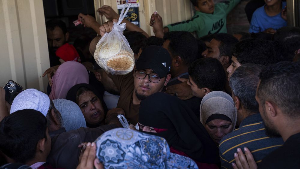 فيديو : شاهد: وسط نفاذ الإمدادات الغذائية.. طوابير مزدحمة أمام مخبز بخان يونس في قطاع غزة