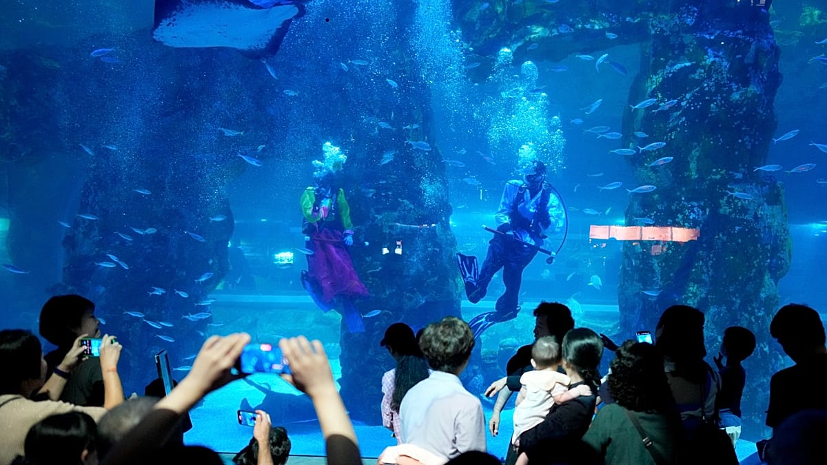 وتابع العرضَ من خارج الحوض عدد من العائلات والأطفال الصغار، في حين قام بعض الغواصين أيضا بإطعام الكائنات البحرية خلال الفعالية.
