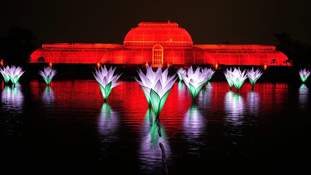 افتتحت حدائق كيو مسارها السنوي لأضواء عيد الميلاد، لتتيح للزوار نظرة أولى على تركيبات جديدة منتشرة في أرجاء الموقع التاريخي.