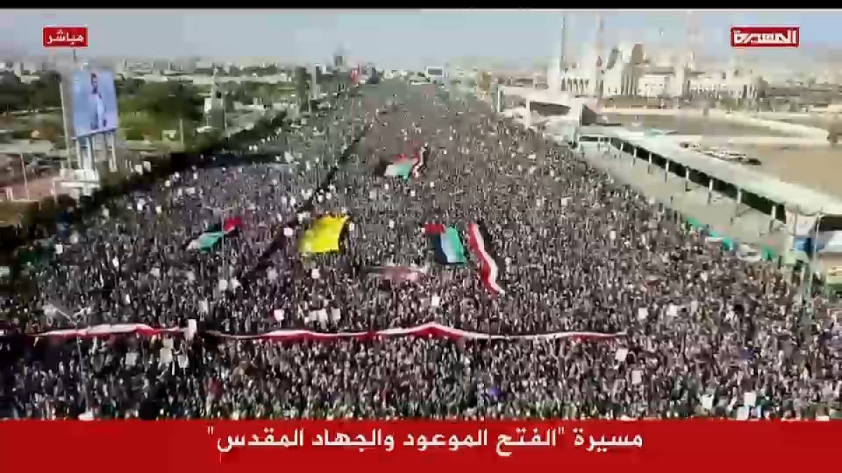 وشوهد المتظاهرون في لقطات بثتها قناة “المسيرة” وهي قناة إخبارية فضائية يديرها الحوثيون وهم يحملون الأعلام الفلسطينية ولافتات الشعار الرسمي للحوثيين وصور زعيم الحوثيين عبد الملك الحوثي.