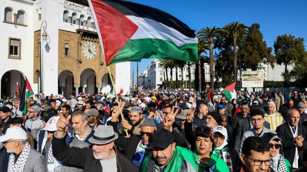 وسار أكثر من عشرة آلاف متظاهر في شارع محمد الخامس في وسط العاصمة تحت شعار “أوقفوا حرب الإبادة على غزة.. أوقفوا تطبيع الدولة المغربية مع الكيان الصهيوني”، بدعوة من الجبهة المغربية لدعم فلسطين ومناهضة التطبيع، المكونة من أحزاب يسارية وجماعة العدل والإحسان الإسلامية المعارضة.