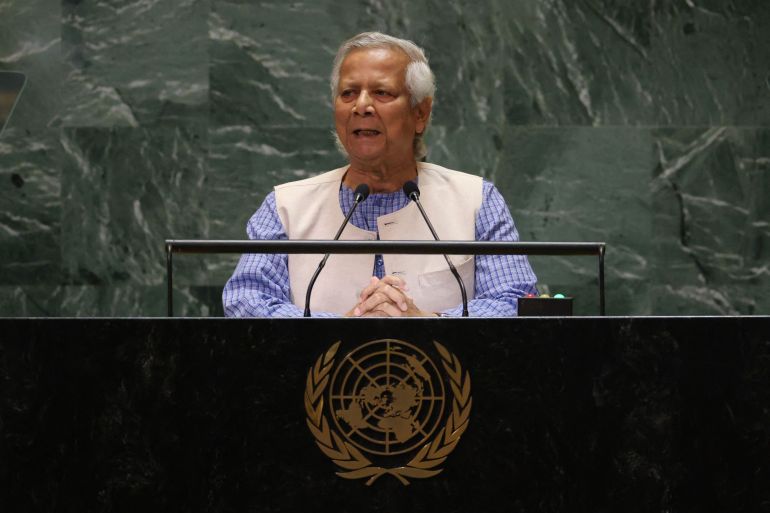 رئيس الحكومة الانتقالية في بنغلاديش محمد يونس خلال الدورة التاسعة والسبعين للجمعية العامة للأمم المتحدة في مدينة نيويورك في 27 سبتمبر/أيلول 2024. (الفرنسية)
