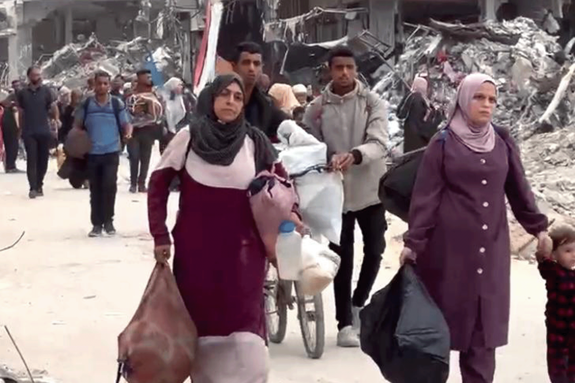 يبدو المشهد كيوم القيامة، رجال يدفعون عربات فيها متاع قليل، ونساء يختزلن بيوتا كاملة في حقائب على ظهورهن، وأطفالٌ يركضون بزجاجات ماء وبأكياس فيها ملابسهم أو بعض أخشاب سيستخدمونها آنفا لإذكاء النار، الكل يبحث عن شبر آمن لا تصل له يد إسرائيل.